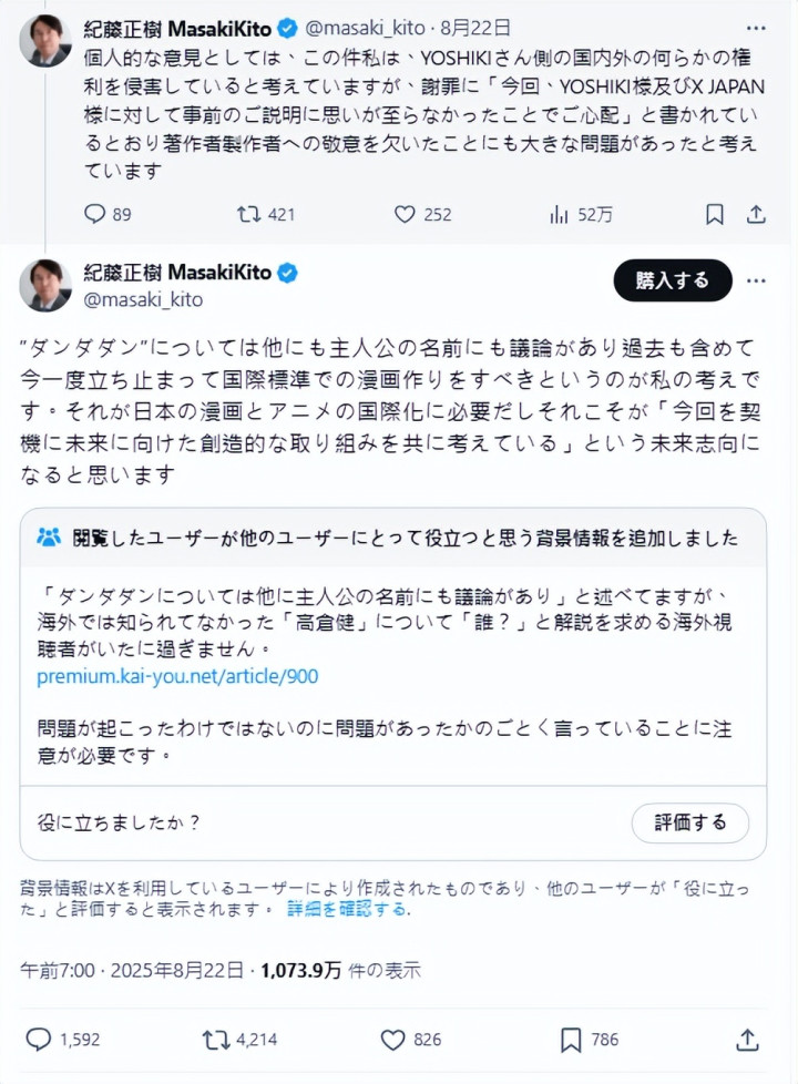 纪藤正树最初是因为“X JAPAN乐队成员YOSHIKI与动画《胆大党》”之间的争议发表了看法。